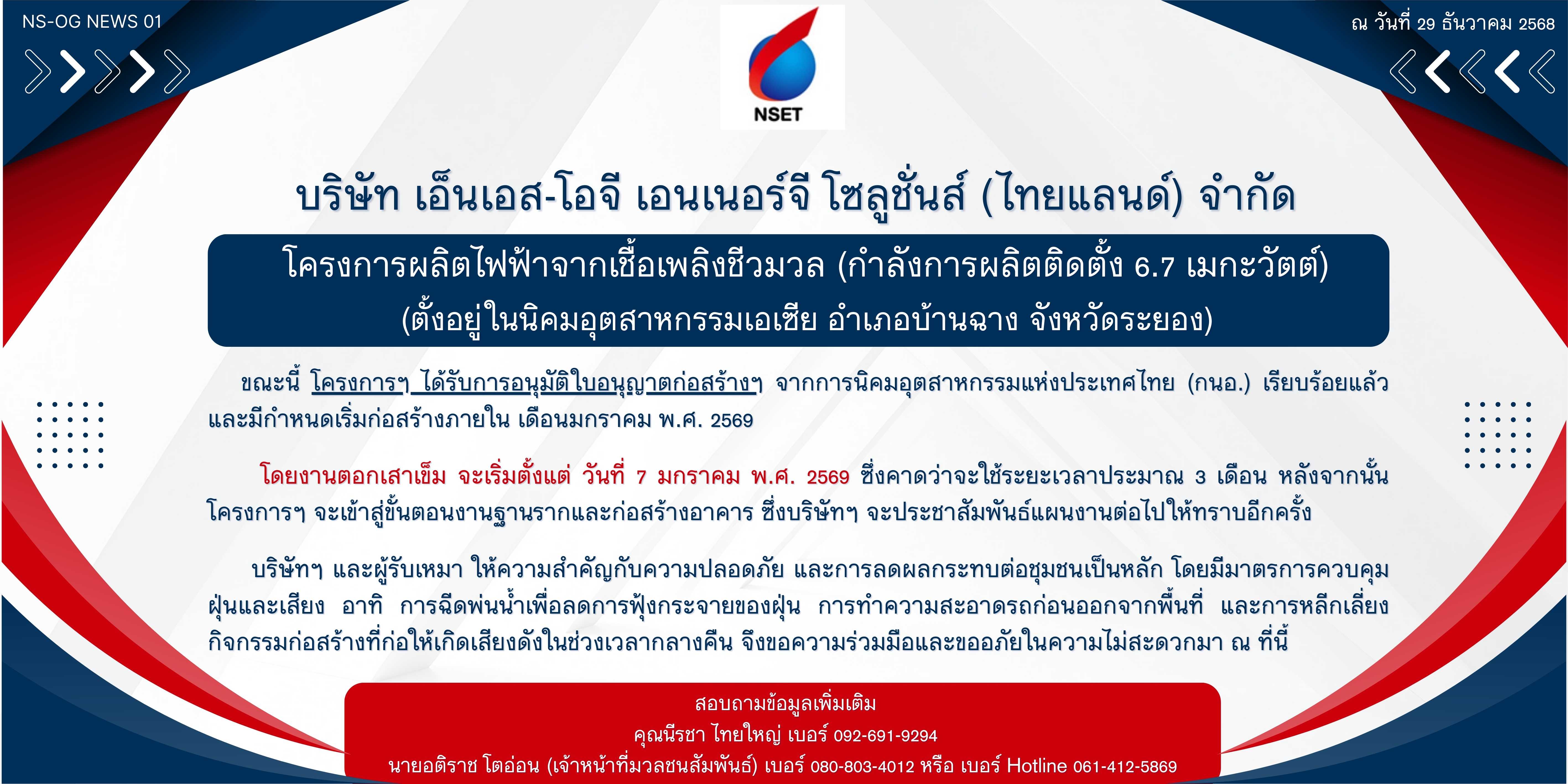ขอเชิญเข้าร่วมการรับฟังความคิดเห็นและทำความเข้าใจกับประชาชนและผู้มีส่วนได้เสีย ในกระบวนการศึกษาและจัดทำรายงานประมวลหลักปฏิบัติ (CoP Report) โครงการผลิตไฟฟ้าจากเชื้อเพลิงชีวมวล (กำลังการผลิตติดตั้ง 6.700 เมกะวัตต์) ของบริษัท เอ็นเอส-โอจี เอนเนอร์จี โซลูชั่นส์ (ไทยแลนด์) จำกัด